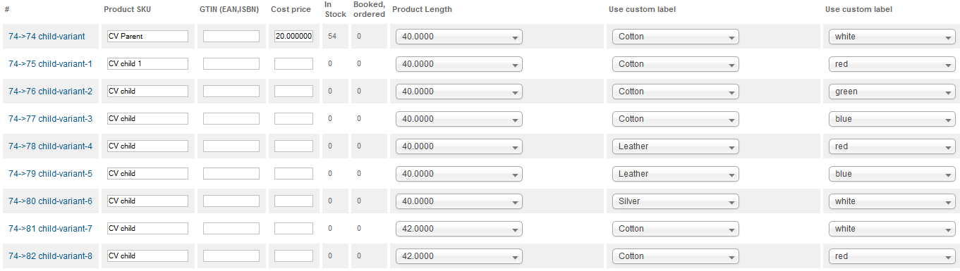 并不是所有的颜色都适用于任何尺寸,而且由于审美原因,“蓝色”的t恤上没有“蓝色”的印记。任何下拉组合都指向一个真实的产品。处理很容易,因为最重要的产品属性可以从父产品访问(变量属性、Sku、价格)。因此,您可以轻松地在一个视图中配置超过50个不同属性的产品,具有不同的库存水平、价格和图片。如果您选择一个已经存在的属性,如长度、重量等,那么您可以使用父产品中的下拉矩阵直接更改值。您还可以修改显示(例如舍入)。